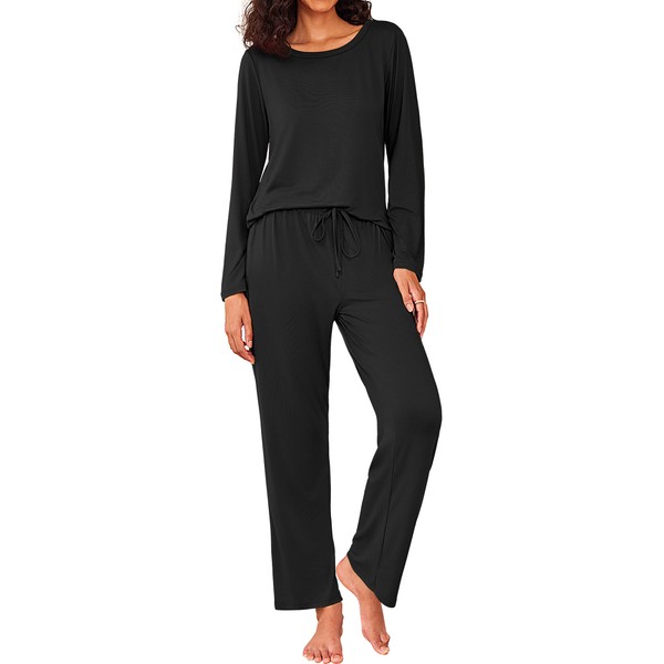 Ekouaer Womens Pajama Sets 2 Piece Pjs Sleepwear Soft Comfy Loungewear Long Sleeve Pullover Top and Pants Black S