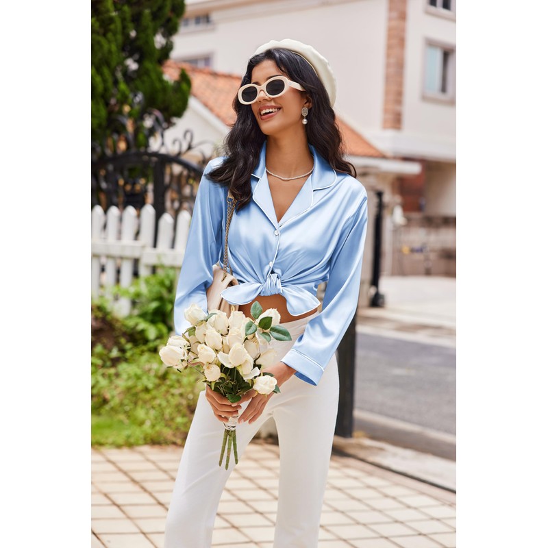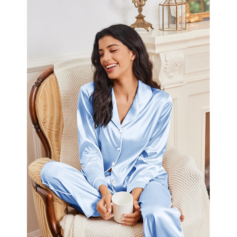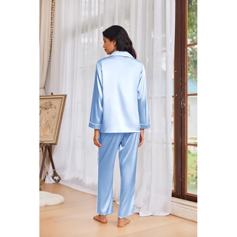 Ekouaer Womens Pajama Sets Satin Silk Pjs Classic Button Down Sleepwear Soft Long Sleeve Lounge Sets Clear Blue M