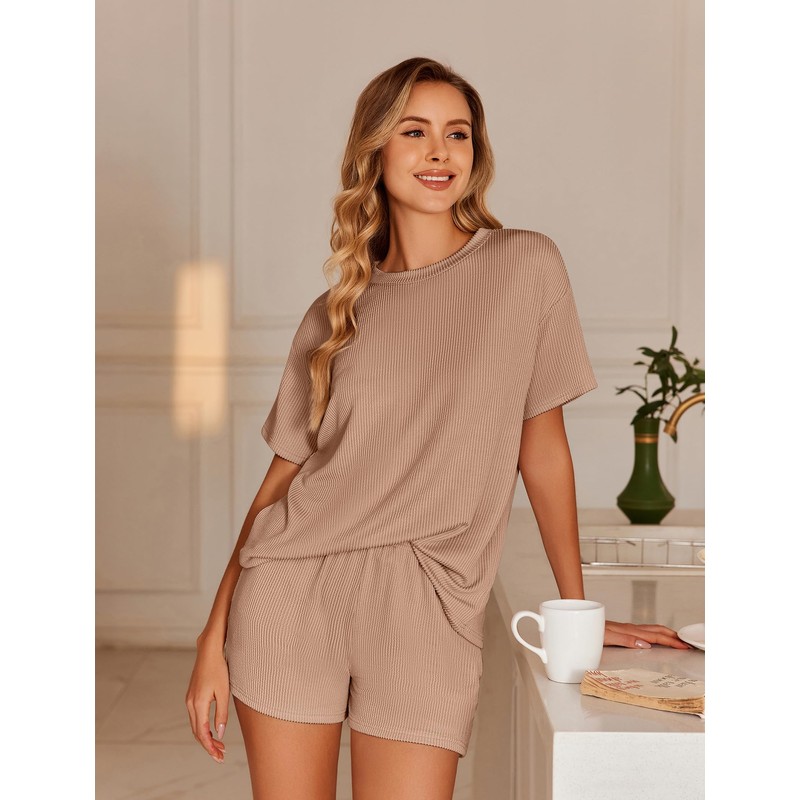 Ekouaer Womens Pajama Sets Short Sleeve Lounge Sets 2 Piece Pjs Tops and Shorts Outfits Matching Loungewear with Pockets Brown