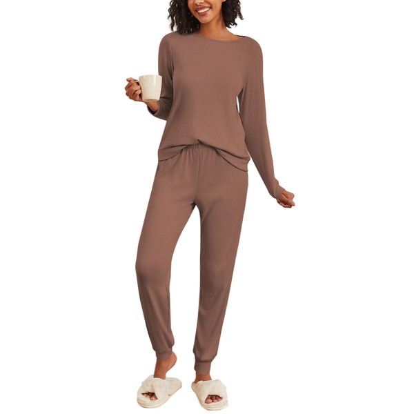 Ekouaer Womens Ribbed Knit Pajama Sets 2 Piece Jogger Pjs Long Sleeve Sleepwear Round Neck Soft Lounge Sets with Pockets Brown X-Large