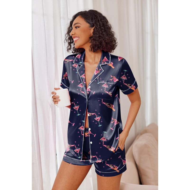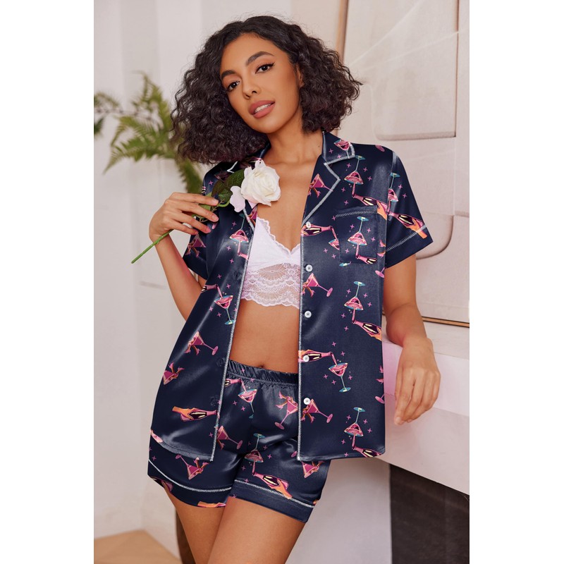 Ekouaer Womens Satin Silk Pajamas Set Short Sleeve Sleepwear Button Down Top and Shorts Loungewear 2 Piece Pjs Set Deep Blue Cocktail Glass X-Large