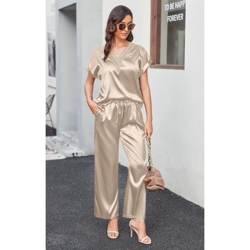 - STYLISH DESIGN: Loose Top: V-neck with lace trim, short sleeves, rolled cuffs. Pants: High stretch wide-leg trousers with elastic bands and 2 sides pockets. Add popular elements on the basis of classic designs to reflect your unique taste.
