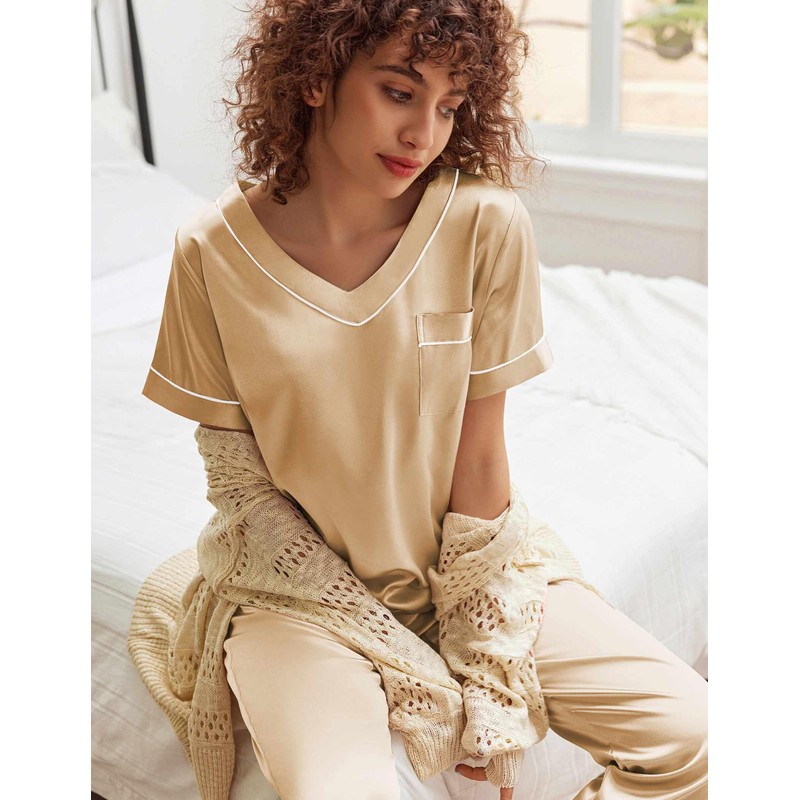 ? Short-Sleeve Satin Top? Women's satin pajama top with a single accent chest pocket front and v-neck design. Shirt-style pocket brings a touch of glamour and coolness, is silky without being revealing, keep you relaxed and attractive. Roomy cut and built in a chic silhouette, make you comfortable all day long