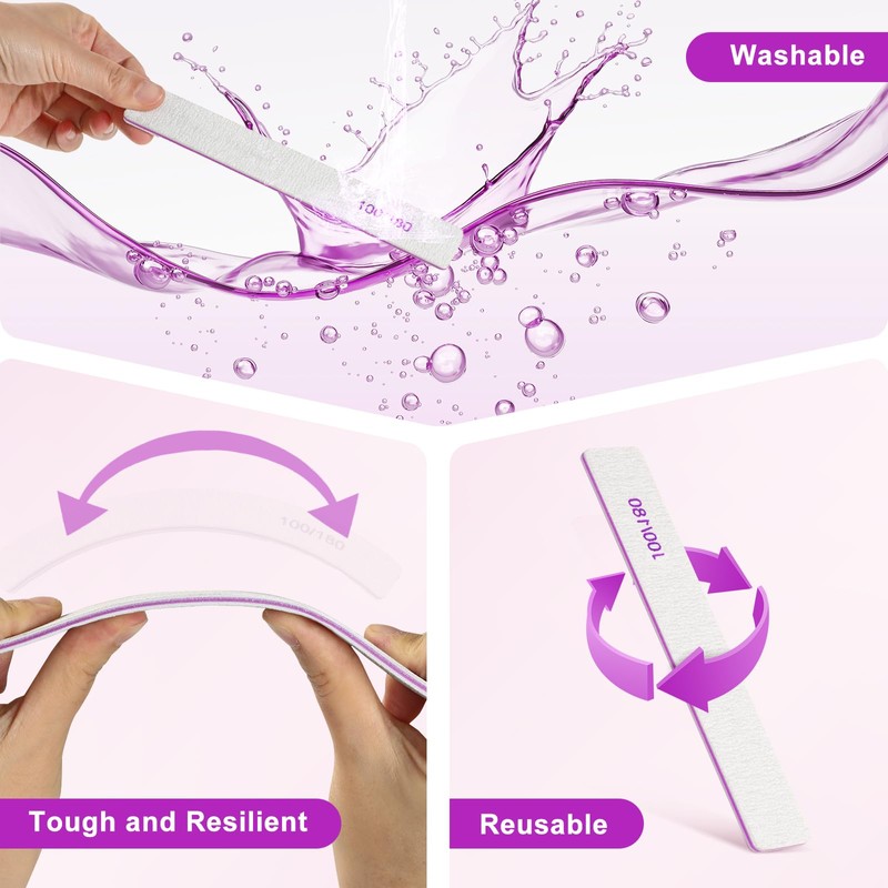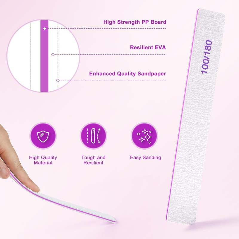 - 100/180 Grit Double Sided Nail Files: The 100 grit side of these nail files is rougher and sharper for shortening nails and removing surface edges, while the 180 grit side is finer and gentler for touching up nail surface imperfections and polishing