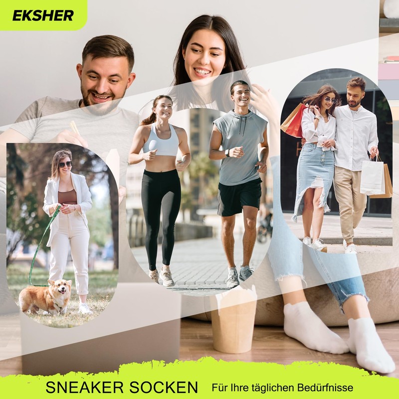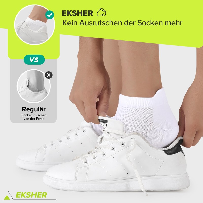 • EKSHER Sneaker socks solve problems such as slipping socks and blisters on the heels during sports. The extended heel design not only ensures that the trainer socks are fixed to the heel and do not slip, but also prevents blisters and chafing when running.