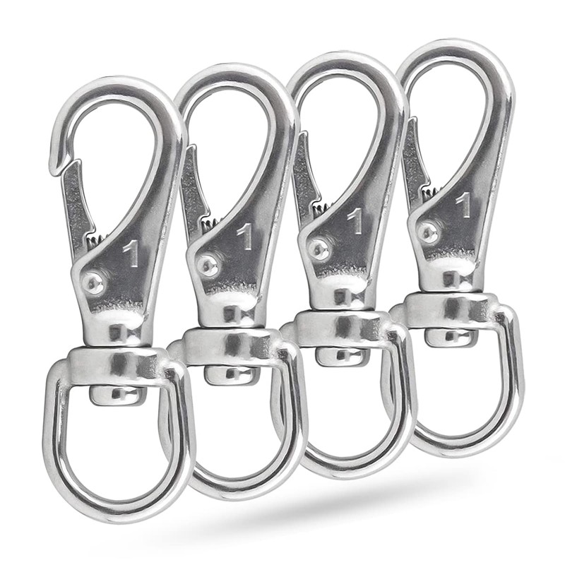 - ✔【Size & Qty】Inside the package is four 3-27/64" swivel snap hooks. 3-27/64" hooks are 3.42" long, 1.18" wide, 0.19" thick, 0.39" max opening, weigh 2.28oz. WLL: 154 lbs