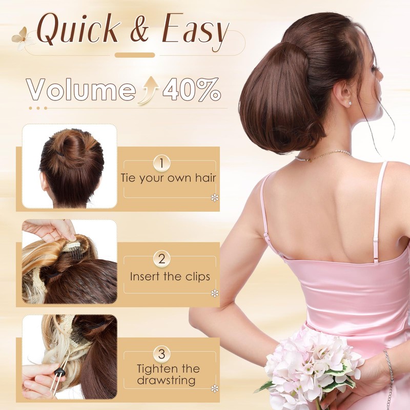- Hairpiece bun: Elegant bun with straight hair, changes the look in 1 minute, natural effect.