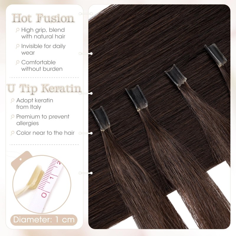 - 100% human hair + mild hair extension keratin glue in U-shape. Provides long-lasting adhesion and the most invisible hair extension without damaging your own hair and scalp. Top quality at an affordable price!