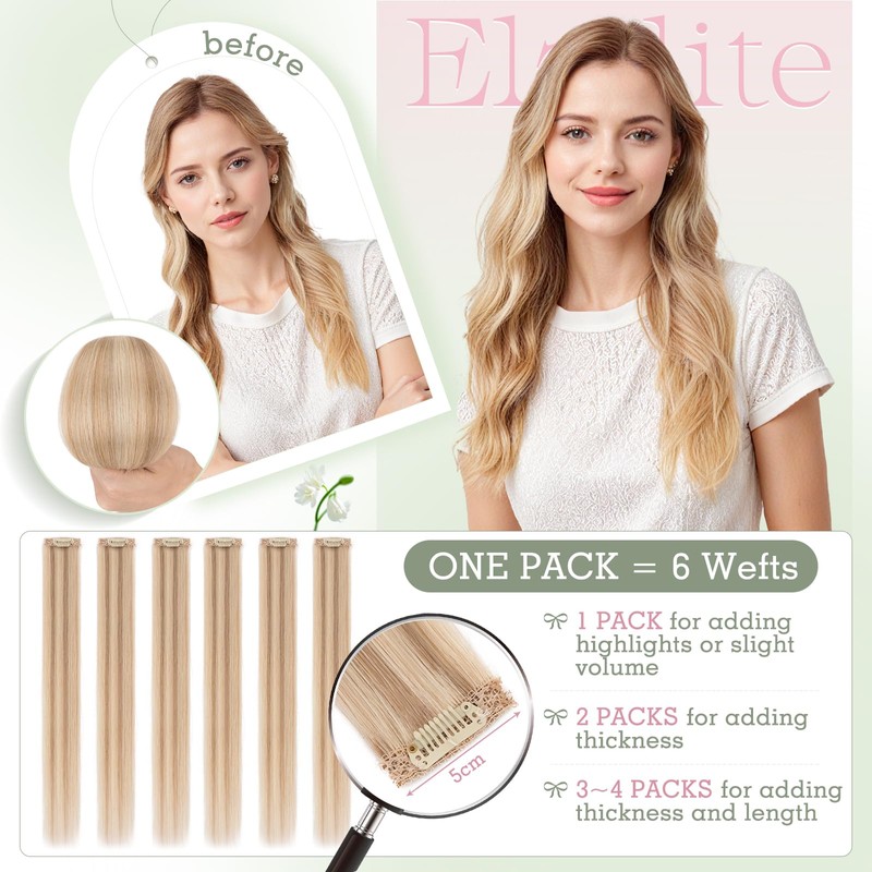 - Clips in extensions: 1 clip pre-assembled on the weft, easy to attach and remove; high grip, no slipping; high-quality material, comfortable to wear and no damage to the scalp.