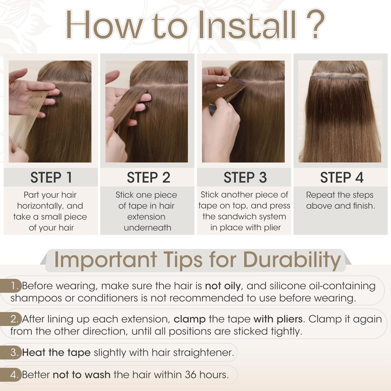 - High-strength adhesive tapes and easy to remove: our tape-in extensions with only 1 cm wide and 4 cm long specially developed high-strength invisible tape, are easy to remove.