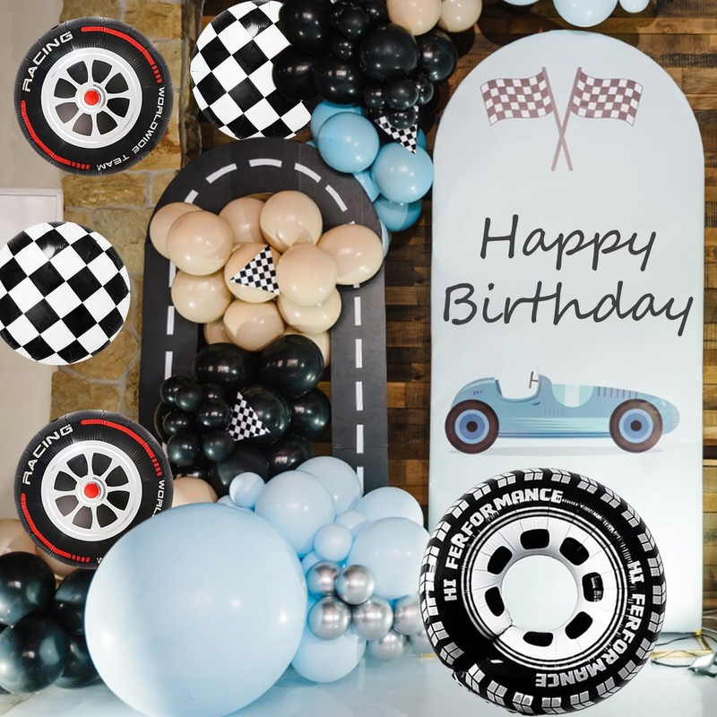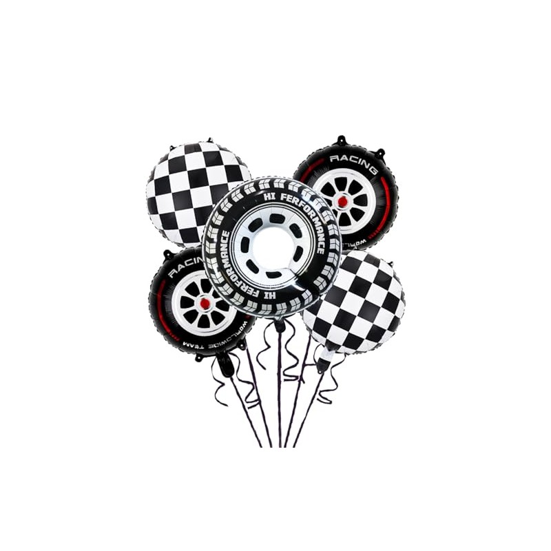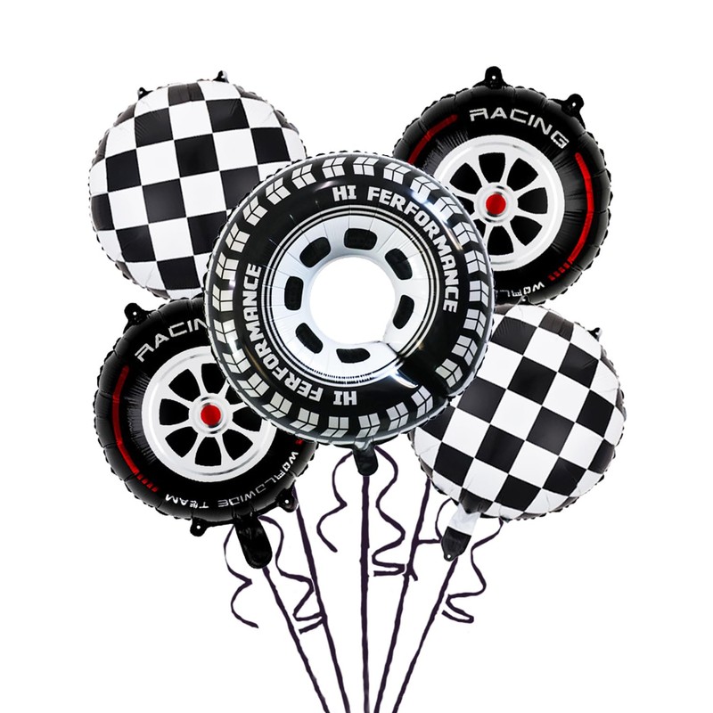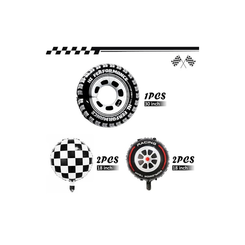 - Package Contents: 5PCS altogether, including 2 black and white checkered round balloons in 18 inch, 2 wheel balloons with red strips in 18 inch and 1 gaint tire balloon in 30 inch