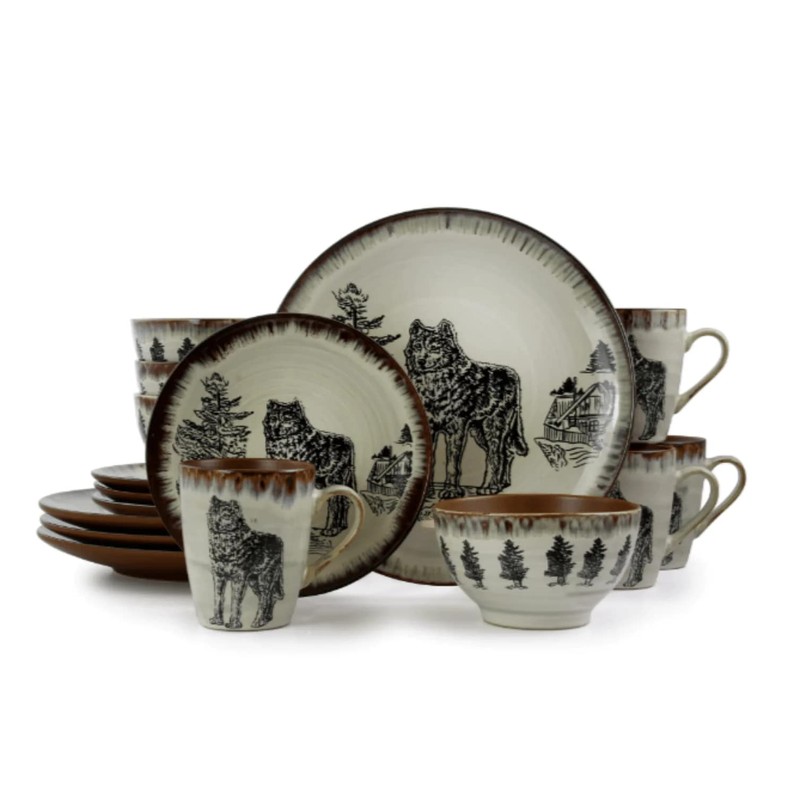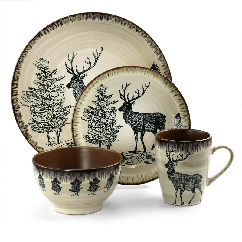 Add a beautiful accent to your dining table with the Elama Majestic elk 16 piece dinnerware set. This complete dish set for 4 is creatively crafted into unique and contemporary shapes and beautifully colored in light and dark wooden brown and black forest accents. Each plate is microwave safe for convenient heating and dishwasher safe for easy cleaning. Set: 16 piece stoneware dinnerware set material: stoneware Color: taupe, Elk decal shape: round finish: reactive glaze microwave safe dishwasher safe Set includes: four 11" Dinner plates four 8" Dessert plates four 5. 5" Bowls four 10oz. Mugs per item dimensions: dinner plate: 11" Diameter, 1" Height, 1. 75lbs weight dessert plate: 8" Diameter, 1" Height, 0. 95lb weight bowl: 5. 5" Diameter, 3" Height, 0. 85lb weight mug: 3. 5" Diameter, 4" Height, 10oz. Capacity, 0. 70lb weight
