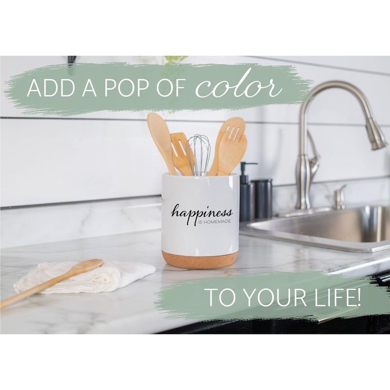 Elanze Designs Happiness is Homemade Ceramic Cork Bottom White Large Capacity Utensil Holder Crock for Countertop Storage, Stylish & Durable for Spoons, Spatulas, and Cooking Tools