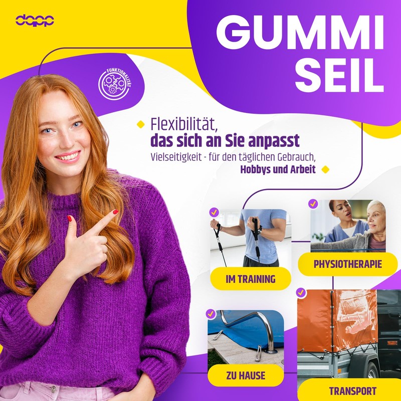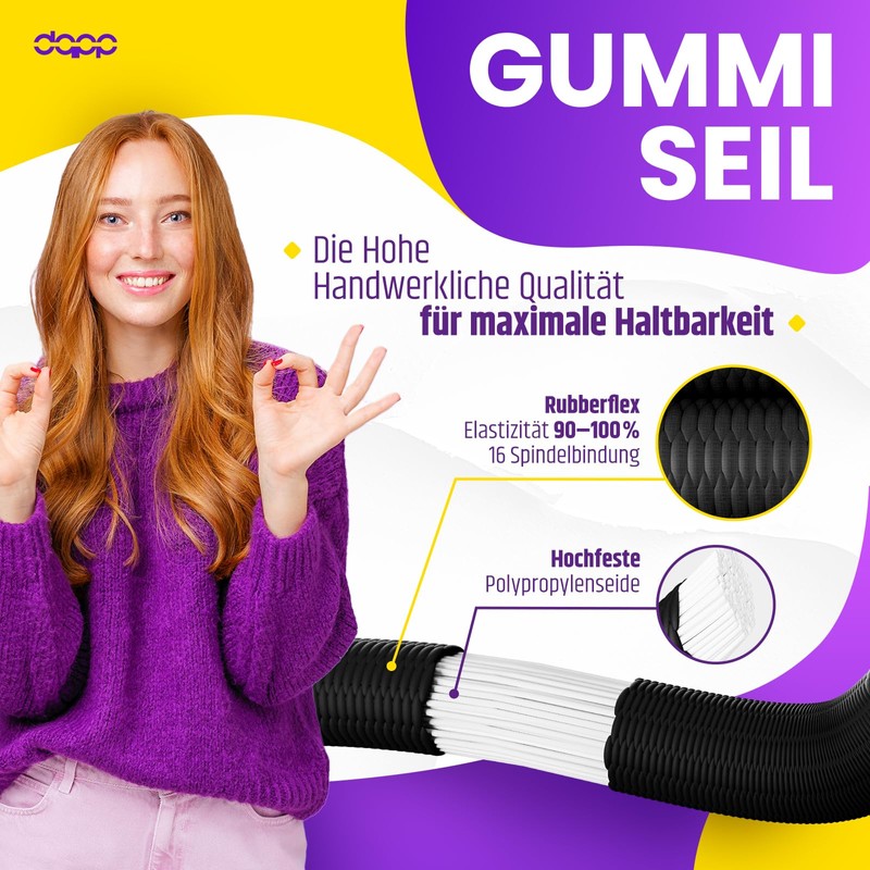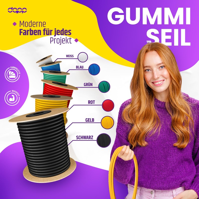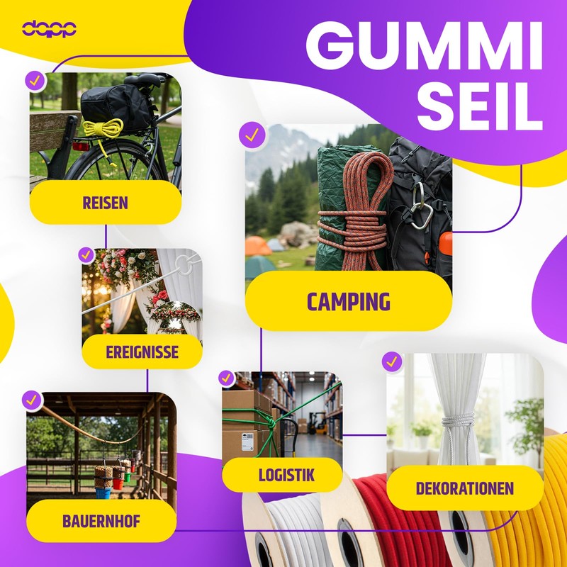- Areas of application: wide range of applications. This rope is suitable for indoor and outdoor use. As a tension rope for securing trailer tarpaulins and container tarpaulins, nets, tarpaulins, fabric tarpaulins, advertising banners, swimming pool covers and much more. Helpful for holding items together. In shipping and fishing, camping, sports. Perfect for travel, bicycle, hunting, kayaking, boating and roof racks; even DIY craft projects, home decorations, tarpaulin tensioners