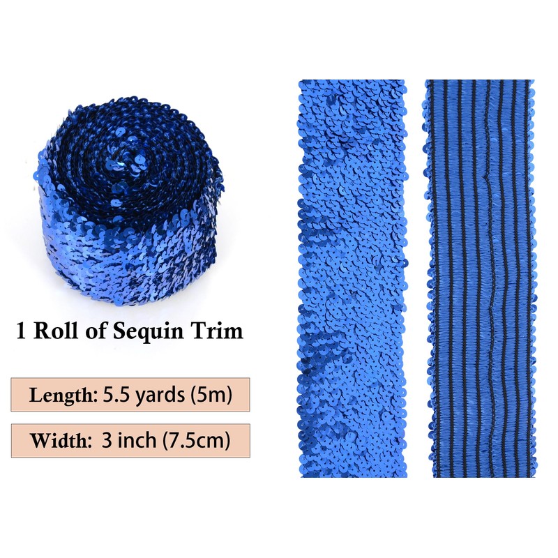 Elastic Sequin Trim, 3 Inch 8 Row Wide Flat Glitter Bling Fabric Paillette Sequin Ribbon, Metallic Stretch Sequin Strip Sewing DIY Embellishment, 5.5 Yards, Royal Blue