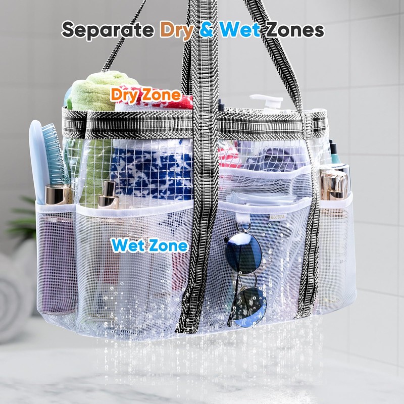 - ✅ Separate Dry & Wet Zones for Better Organization: Features two smart compartments: a dry main compartment for towels, clothes, or slippers, and 7 breathable mesh pockets for wet items like shampoo, soap, razors, and more. Keeps everything clean and organized.