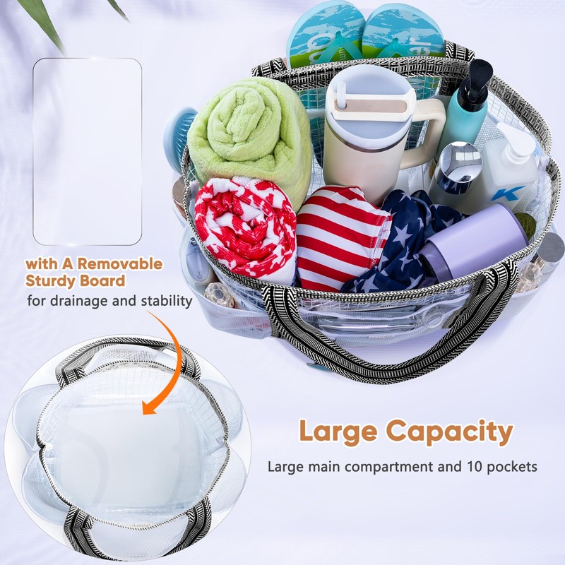 - 📦Spacious size: 17" x 8" x 12". The large main compartment fits towels, clothing, hairdryer, or flip-flops—perfect for full shower setups or beach trips. Includes 3 inner pockets to keep smaller items neatly organized.