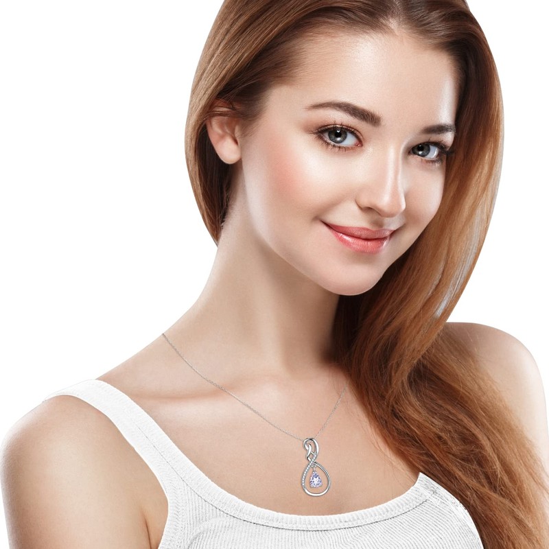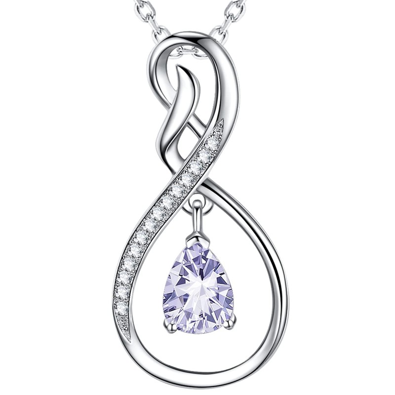 - ❤️ June Birthstone Necklace - Pear Shaped light purple Alexandrite setting in the elegent design infinity pendant with simulated diamond sparkle side stones. 18K white gold plated over sterling silver pendant and 18"-20" adjustable chain.