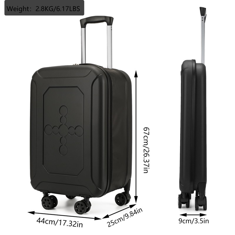 - Size: This luggage has two sizes: 20 inch (14.17 "L*8.26 "W*21.65 "H), weight 4.6 lbs. 24 inch (17.32 "L*9.84 "W*26.37 "H), weight 6.17 lbs. Very clean and elegant design, either one is enough for your daily use