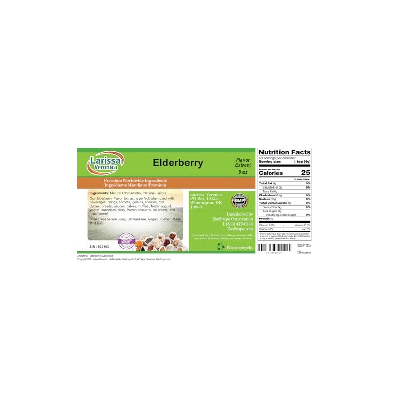 - Elderberry Flavor Extract (8 oz, ZIN: 529163): Our Elderberry Flavor Extract is perfect when used with beverages, fillings, sorbets, gelatos, cookies, fruit glazes, breads, sauces, cakes, muffins, frozen yogurt, yogurt, cupcakes, dairy, frozen desserts, ice cream, and much more!