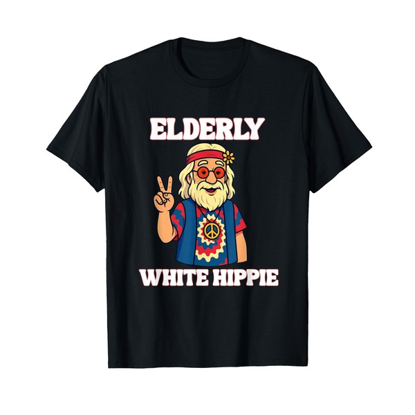- Elderly White Hippie features an old hippie raising his peace sign in a patriotic tie dye tee.