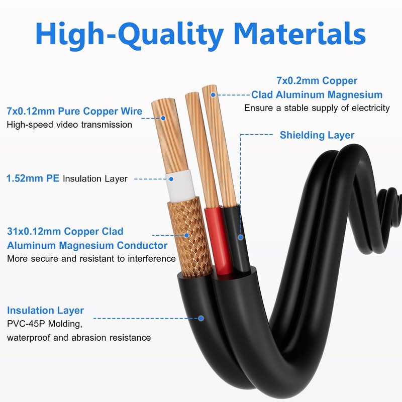 - Premium material & Smooth 5MP Transmission: Gold-plated core riveted BNC male connector, pure copper conductors, lower resistivity & better electrical conductivity, excellent ductility, low power & voltage consumption, resistant to corrosion & oxidation. The Elecan Video Power Security Camera Cable can work well to transmit video signals and provide DC power for the 5MP surveillance camera system