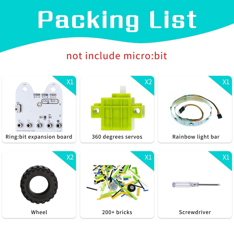 Basado en el anillo: bit V2 de Elecfreaks, el paquete de ladrillos de micro: bit Ring: bit contiene servos de 360 grados, las tiras LED y casi 200 piezas de ladrillos. Junto con las instrucciones y cursos de montaje bien diseñados, hace que los niños aprendan la codificación fácilmente, así como cómo construir bloques de una manera interesante. ¡Empecemos a construir nuestros kits con las puntas!