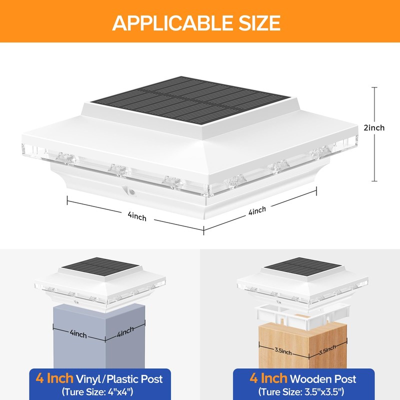 - 【Durable Materials & IP65 Waterproof】Built to withstand the elements, this post cap lights solar powered is rated IP65 waterproof, making it resistant to rain, snow, and even hail—no need to worry about harsh weather. Unlike many other solar lights for fence posts, our solar fence post cap lights is made from corrosion-resistant ABS material for enhanced durability and a longer lifespan. These 4x4 solar post lights are perfect for outdoor use. Buy once, use for the long term — a more cost-effective choice that saves you the hassle and expense of frequently replacing deck post solar lights