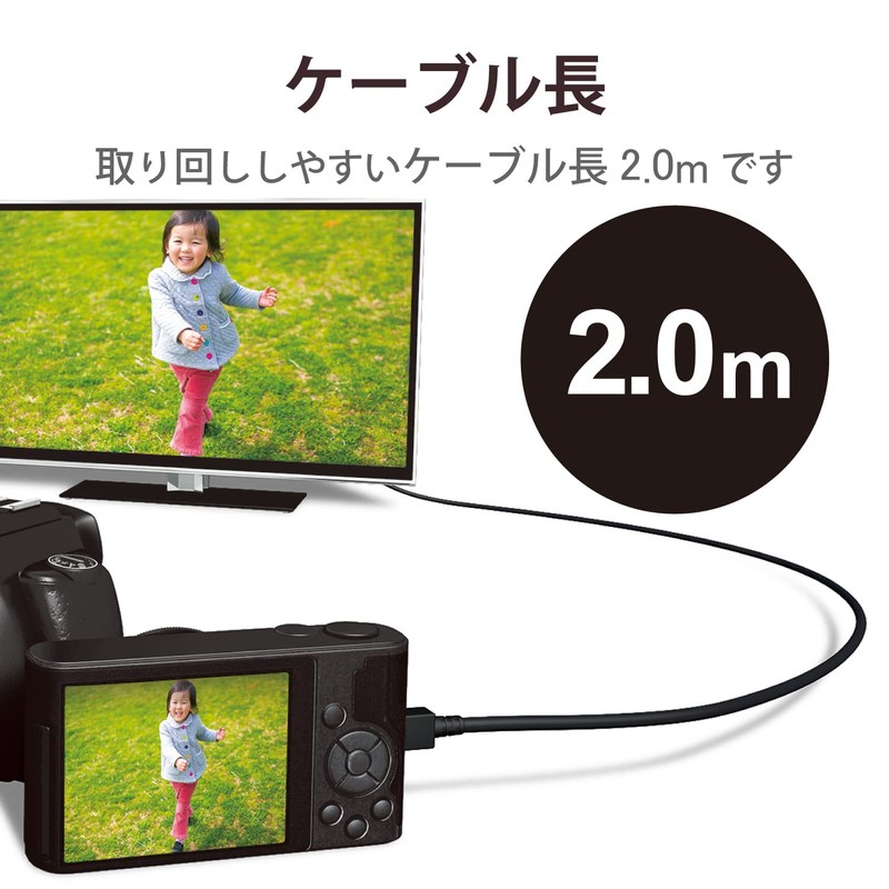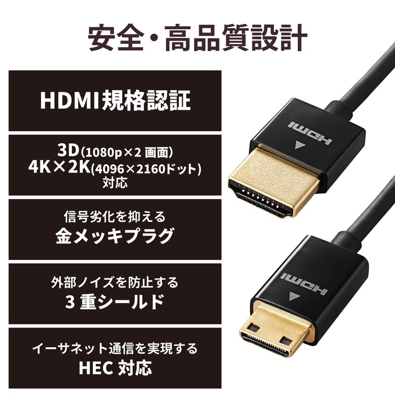 Elecom DGW-HD14SSM20BK Mini HDMI Cable, 6.6 ft (2 m), Supports 4K x 2K, Super Slim, Black