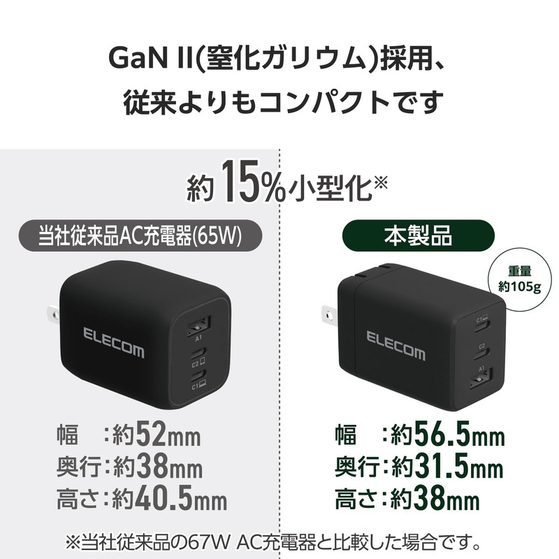 Elecom MPA-AC10367BK Charger, 67 W, 3 Ports, USB-C x 2, USB-A x 1, USB PD Compatible, Swing Plug, Black