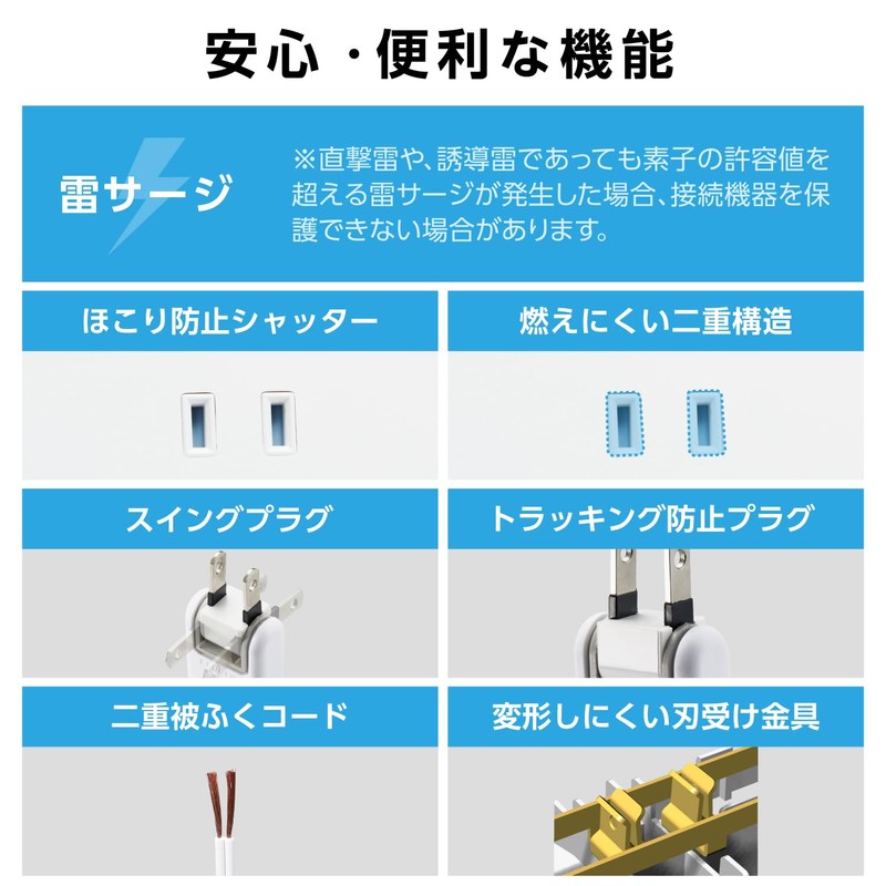 - Surge current tolerance: 3,500 A / 10 times limit voltage 935 Vmax (500 A 8/20 μs) elements (baristor) that absorb lightning surges caused by induction lightning to protect the connected devices. Even if there is a surge that exceeds the tolerance of the elements, even if it is a direct torpedo or inductive thunder, the connected device may not be protected. In addition, performance will deteriorate depending on the voltage and number of times received.