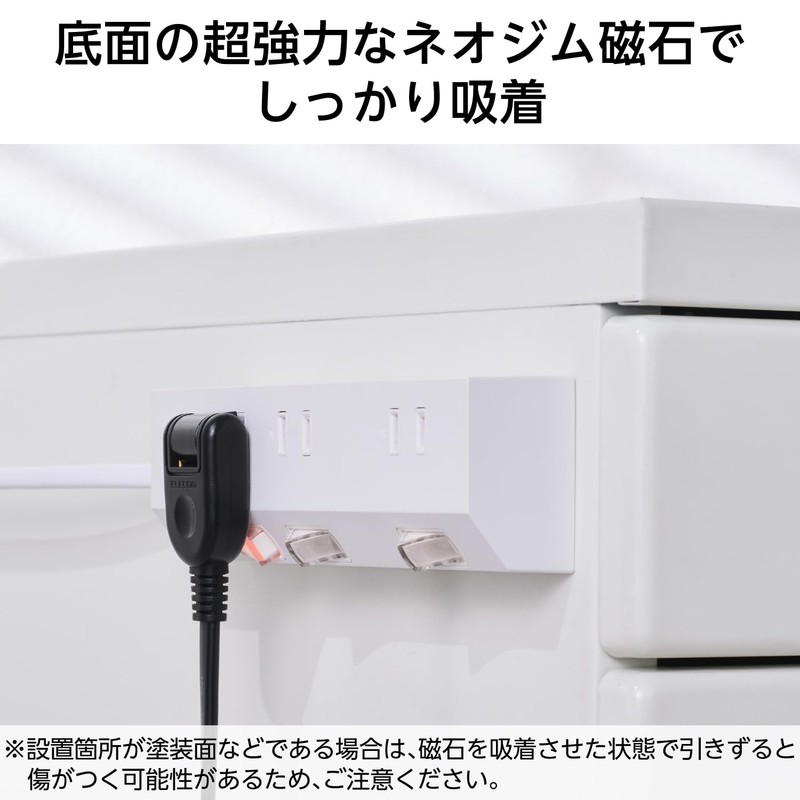 - The bottom of the tap is equipped with a powerful neodymium magnet that adheres securely, so even if you insert a heavy AC adapter or other items into the outlet