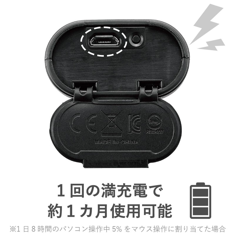 - Power Supply: Built-in lithium ion rechargeable battery (estimated battery usage time: about 32 days *When using a computer for 8 hours per day, the mouse is assigned to 5% operation)