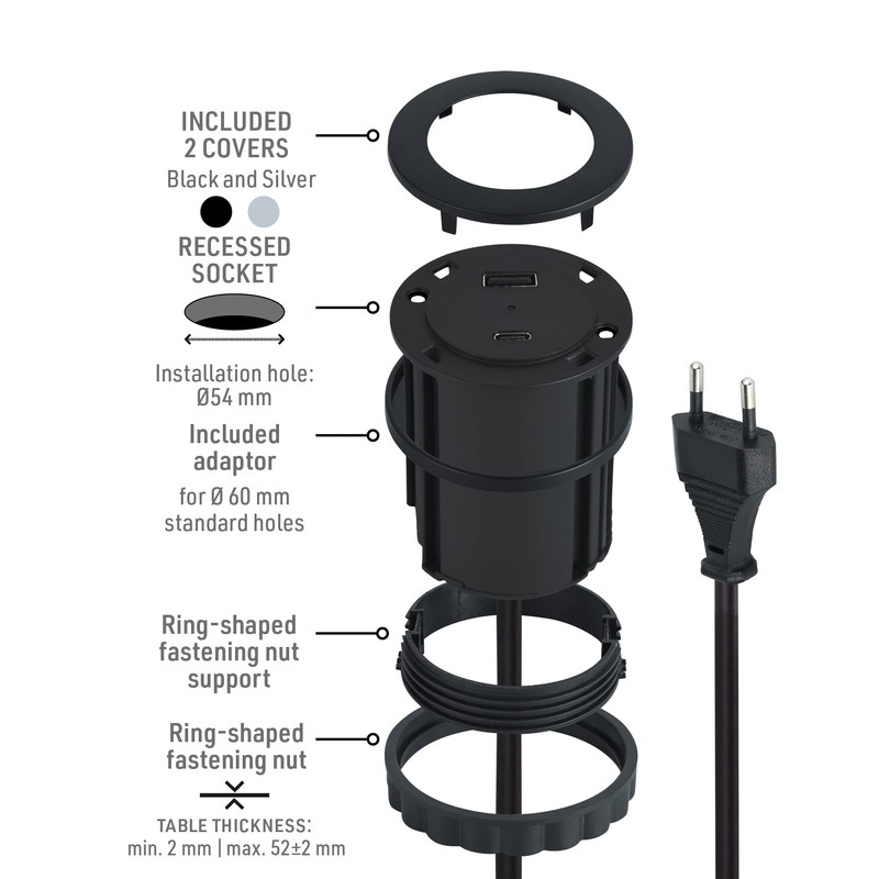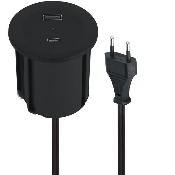 Steckdosenleiste mit 2 USB: 1 USB 45 W Typ C P.D. (Power Delivery) zum Aufladen Ihres Laptops + 1 USB Typ A Anschluss 3.0A (Fast Charge). ABMESSUNGEN: Max. H?he des K?rpers unterhalb der Tischplatte: 62mm. Erforderlicher Bohrungsdurchmesser: 54 oder 60mm (D 54mm + Ausgestattet mit Adapter f1r Standardl?cher 60 mm). Kabel H05VV-F 2x0.75mm, Lange 3 Meter. USB C output: 5.0V-3.0A / 9.0-3.0A / 12.0V-3.0A / 15.0-3.0A / 20V-2.25A Max. 45W. USB A output: 5.0V-3.0A / 9.0-2.0A / 12.0V-1.5A Max. 18W. DESIGN: Diese Steckdose bringt Ordnung in die B1ro, K1che oder Werkstatt. Sie 1berzeugt dabei durch ein sch?nes Design und tolle Verarbeitung. Durch seine zeitlose Optik passt sich diese Steckdose optimal jeder Umgebung an. optisch sch?nem Flachstecker