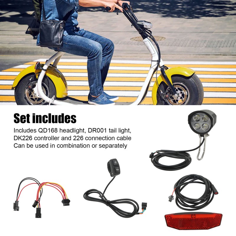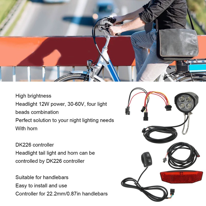 1、SET INCLUDES: Electric bicycle front rear light set contains QD168 headlight, DR001 tail light, DK226 controller and 226 connection cable, can be used in combination or separately. 2、APPLICABLE OBJECTS: Electric bike light set can be used for electric power bicycle, electric bike, electric scooter and other modifications and replacement of damaged parts, you can modify and use according to their own situation. 3、HIGH BRIGHTNESS: Headlight 12W power, 30‑60V, four light beads combined, the perfect solution to your night lighting needs, with a horn. 4、DK226 CONTROLLER: Headlights and taillights and horn can be controlled by DK226 controller, easy and fast operation. 5、APPLICABLE HANDLEBARS: Electric bike headlight tail light set is easy to install and use, the controller is suitable for 22.2mm handlebars.