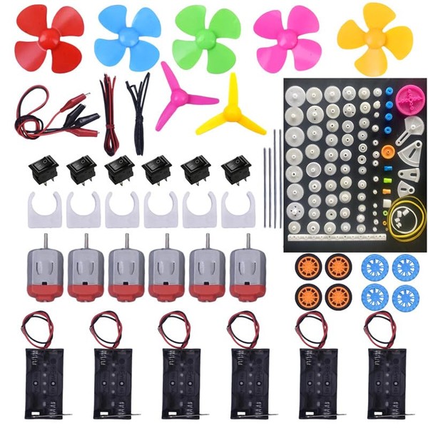 - 🔌 Complete Circuit Kit: Includes 6 DC motors, 6 battery holders (AA), 6 rocker switches, 6 motor mounts, 8 Wheels, 12 electronic wires, 2 crocodile clip leads, 85 plastic gears, 5 four-vane propellers, 2 three-vane propellers, 50cm Φ3 heat shrink tubing.