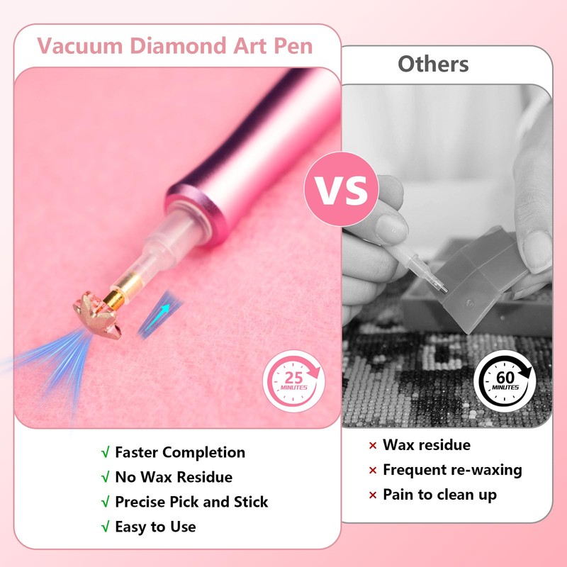 - Easy draw with a vacuum pen for diamond painting: No more wax! Our electric diamond painting pen use vacuum technology to easily pick up diamonds and place them precisely on the canvas. Make the painting process easier and faster!