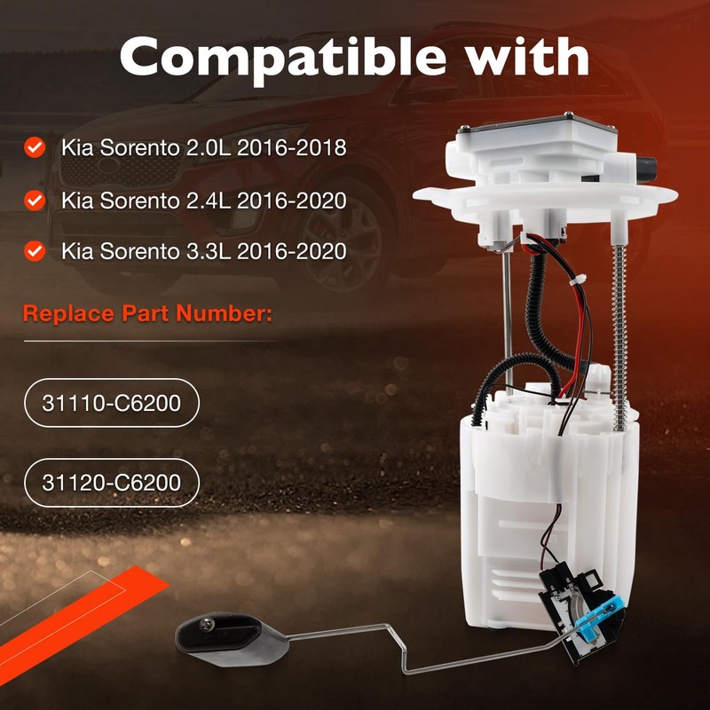 - 1️⃣ Vehicle Compatibility & OEM Replacement: Compatible with Kia Sorento 2.0L (2016–2018), 2.4L (2016–2020), and 3.3L (2016–2020) engines. Replaces OEM part numbers: 31110-C6200, 31120-C6200, 31110C6200, 31120C6200, and others. Perfect replacement for your original fuel pump module assembly.
