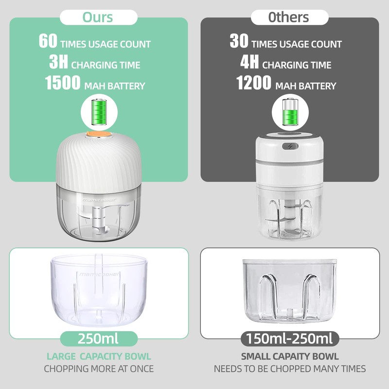 - 【Perfect Size & Portable】: This onion chopper adopt a lovely size(4" x 4" x 5") to meet the use in daily life, due to the portability and convenience of the 60W garlic chopper, you can even take it with you to do something cool, such as camping, travel, picnics, barbecues, etc. (built in 1500mAh USB rechargeable battery, 3h of charging can meet 30 days of long time use)