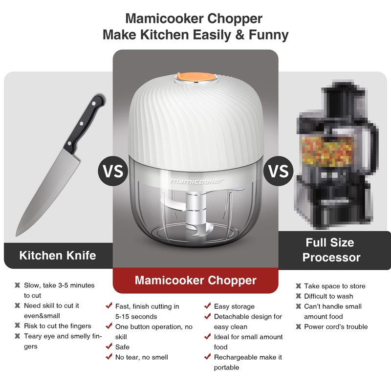 The Mamicooker mini chopper blender and food processor combo to handles a variety of food preparation tasks including chopping, grinding, pureeing and blending. The three s-shap stainless steel blades provides a super-sharp edge for the delicate chopping of herbs and for blending and pureeing other soft foods. Using this Grinder‘s powerful high-speed 60-Watt motor works hard and fast to accomplish any small job with ease. Chop onions, garlic, nut, meat, salad, nutri, cheese, puree baby foods. It is very convenience for kitchen, camping, RVs, travel, picnic and anywhere. It may be the most mini but powerful kitchen appliances that you had used.