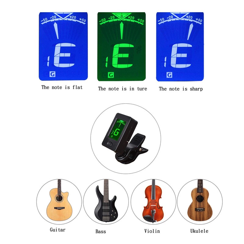 • 【HIGH PRECISE GUITAR TUNER:】 High precise detection and sensitive vibration guitar tuner, clip-on, battery included, no background noise, good for applicable to a variety of environments, designed for Guitar, Chromatic, Bass, Violin, Ukulele, etc.