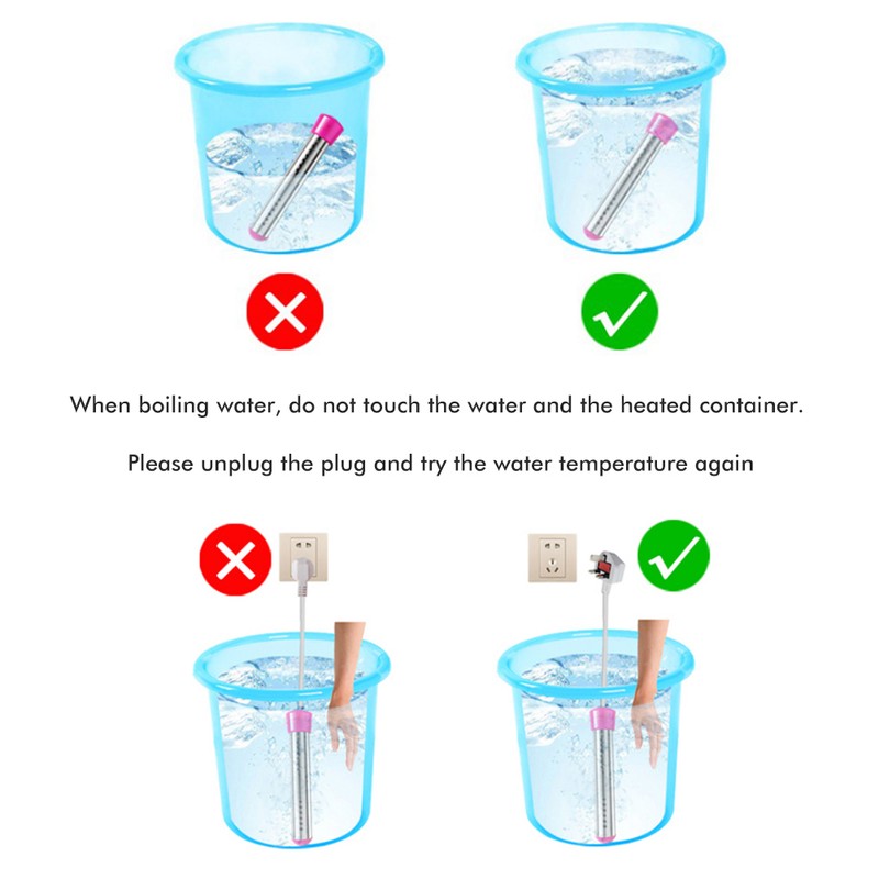 4. Easy to use: The immersion water heater is easy to use, just put the electric heater into the water container, then cover the hot water completely with the heating element in the stainless steel protection, then plug it into any grounded wall socket.
