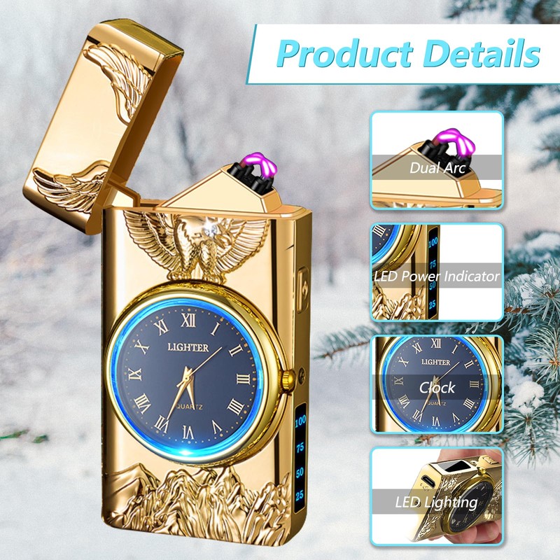 Electric Lighter with Clock YOZWOO USB Rechargeable Lighter with LED Light, Plasma Dual Arc Lighters with LED Power Display for Candle, Cool Lighters Gifts for Men and Women (Gold-Eagle)