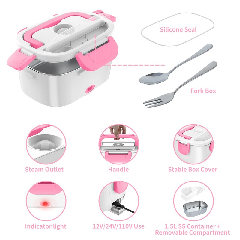 CHARMDOO Electric Lunch Box, Food Warmer Heater 12V 24V 110V, 80W Faster Heated Lunch Box for Car/Truck/Home Portable Heating Boxes with 1.5L 304 SS Container Fork & Spoon, White+Pink