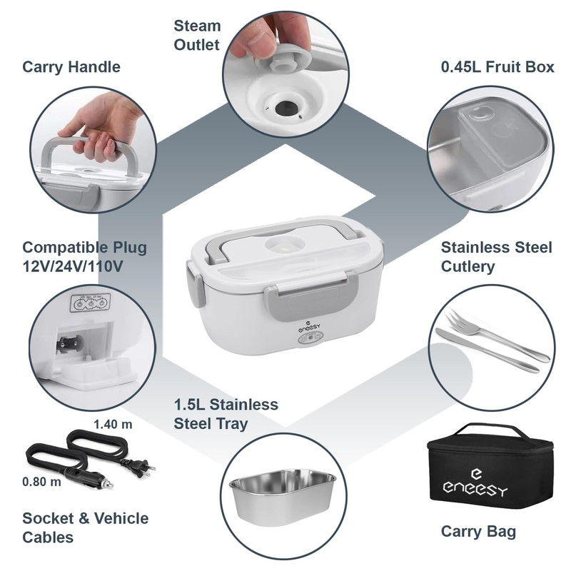 • SAFE & EASY TO CLEAN - Designed for convenience, our heated lunchbox features a removable 1.5 L stainless steel container and a leak-proof seal gasket on the lid to prevent spills. Dishwasher safe for effortless cleaning.
