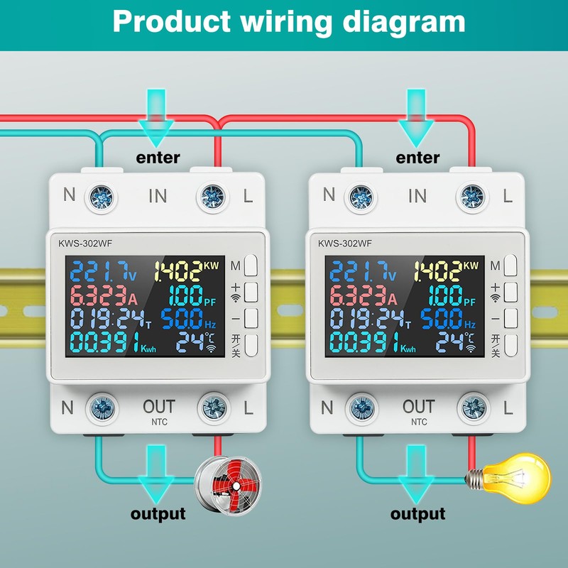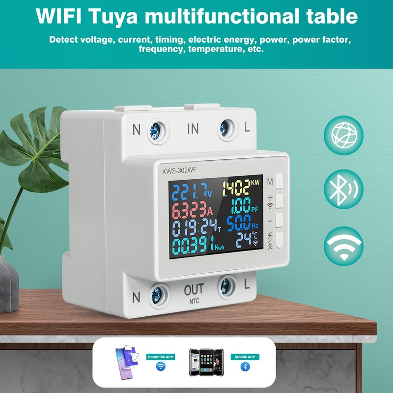 Electric Meter WiFi Tuya Smart Meter Electricity Meter DIN Rail AC Meter Voltage/Current/Frequency/Power/Power/Energy HD Digital Colour Display AC170-300V/63A Model KWS-302WF