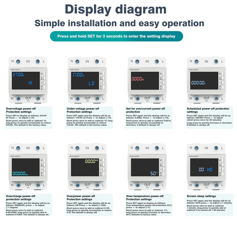 - 8 in 1 WiFi electricity meter: 1 interface detects and displays many types of data at the same time: voltage, current, timing, electrical energy, power, power factor, frequency, temperature and so on.