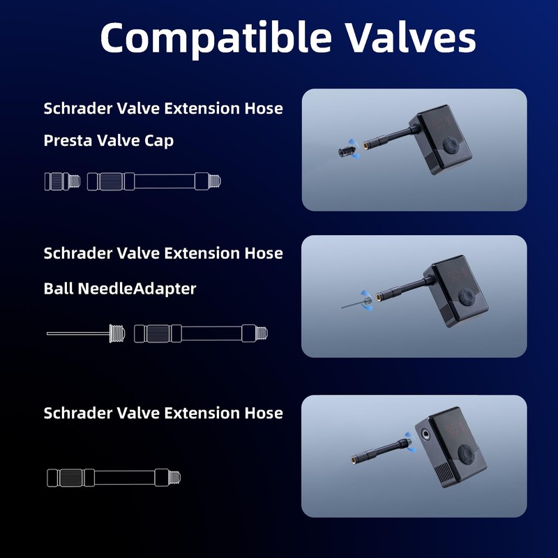- 2 Kinds of Valves: The bike air pump is compatible with both Schrader and Presta valve. The hose can help to avoid any awkward angles or blind spots