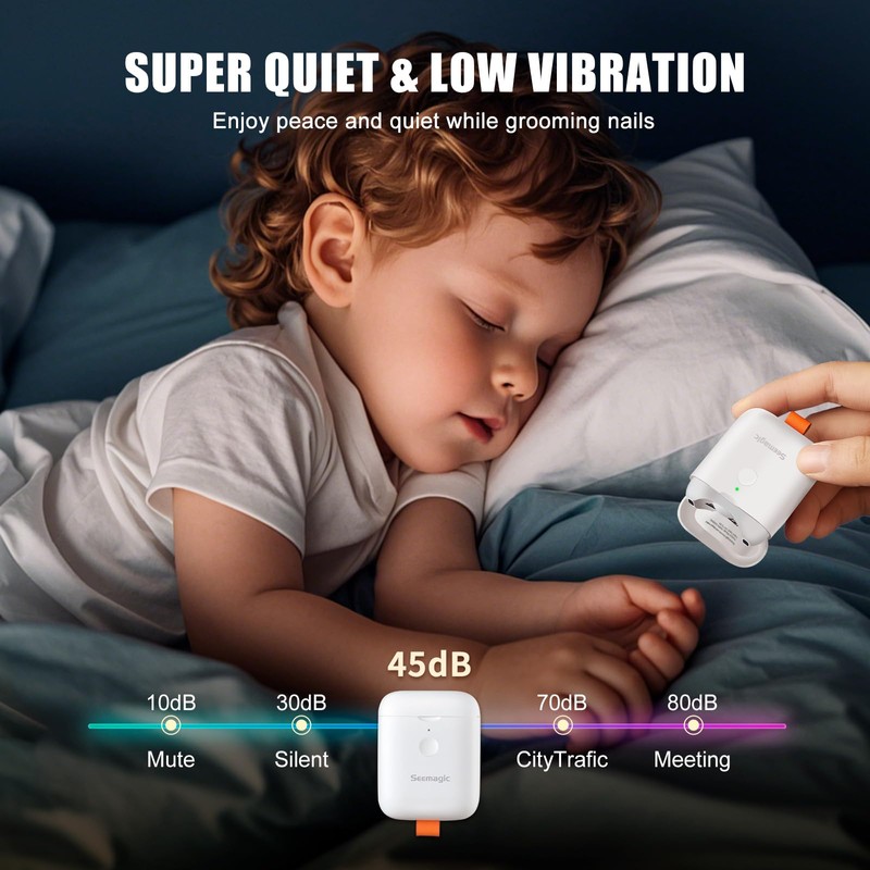 - 【LED Lighting and Silent Operation】Designed with auxiliary lighting and a silent motor, this nail clipper ensures you can safely trim nails even in dark environments. The low-noise motor is perfect for young children and infants who are sensitive to loud sounds, allowing you to trim nails without waking a sleeping baby.