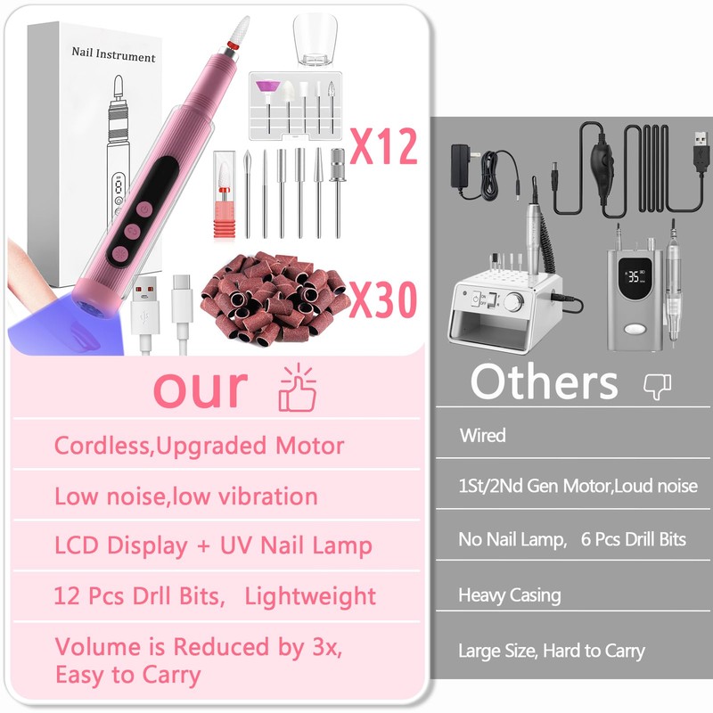 - Multifunctional Nail Drill Kits:The electric nail file kits has a U V nail lamp installed and comes with 12 different nail drills bits and sanding bands, 9 different speeds for maintaining nails, trimming nails, buffing nails, treating thick nails, cuticles, removing acrylic nails, gel nails, and powdered nails, to meet your different nail care needs